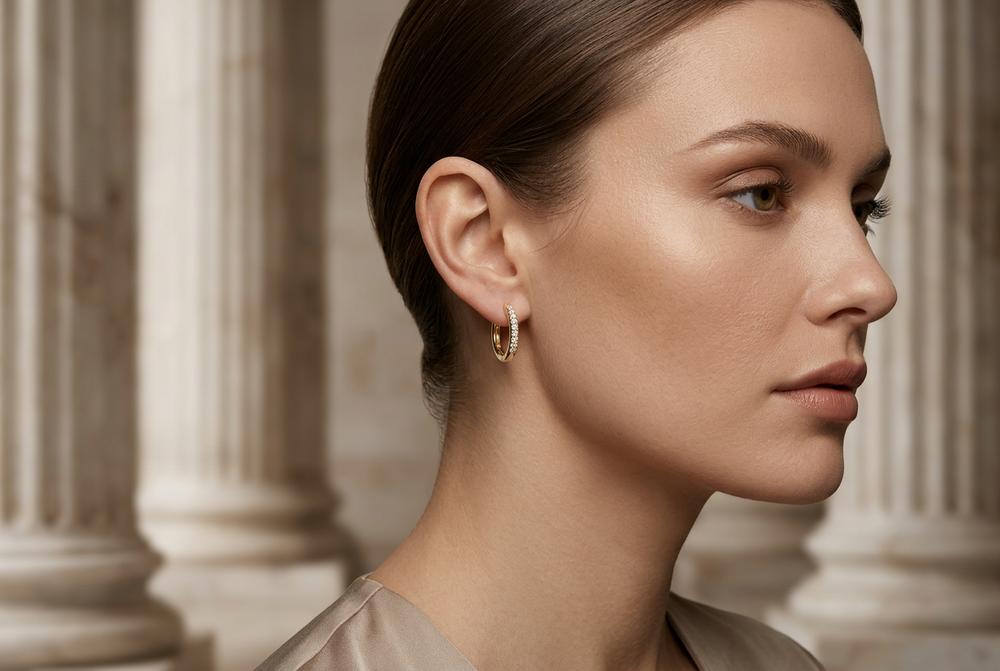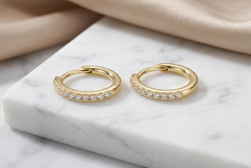 Die Creolen bestehen aus 925 Silber und sind mit einer glänzenden Goldschicht überzogen. Sie haben einen Durchmesser von 14mm, eine Stärke von 2mm und wiegen etwa 1,7g. Die Verarbeitung ist sorgfältig und präzise, wodurch die Creolen einen edlen und eleganten Eindruck machen. Die Ausführung ist so gewählt, dass sie alltagstauglich sitzt und sich angenehm trägt.